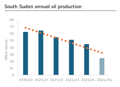 - South Sudan (22.4%) – Restoration and rebound of oil export capabilities. After the Petrodar pipeline was damaged in February 2024 during Sudan’s civil war, oil exports — which account for ~98% of government revenue — plummeted from 186,000 barrels per day in January 2024 to just 58,000 bpd in December 2024.